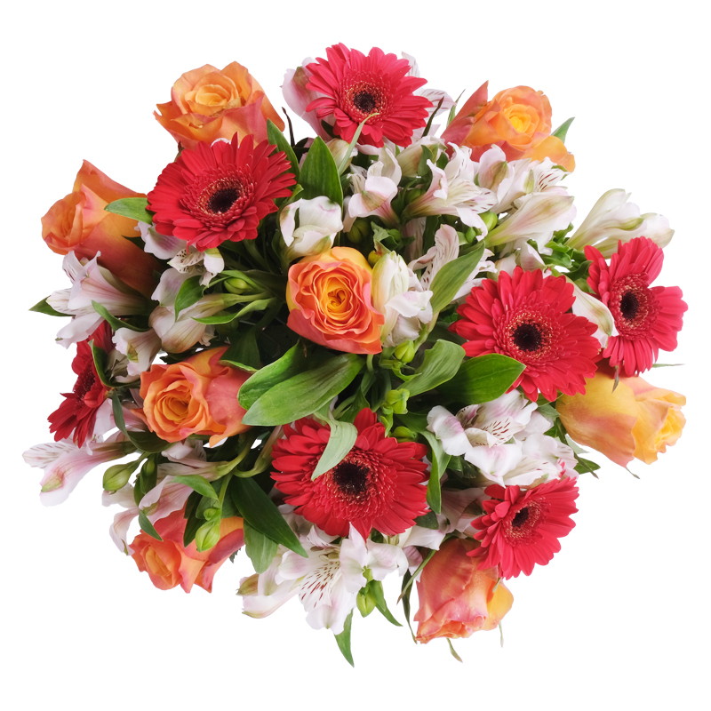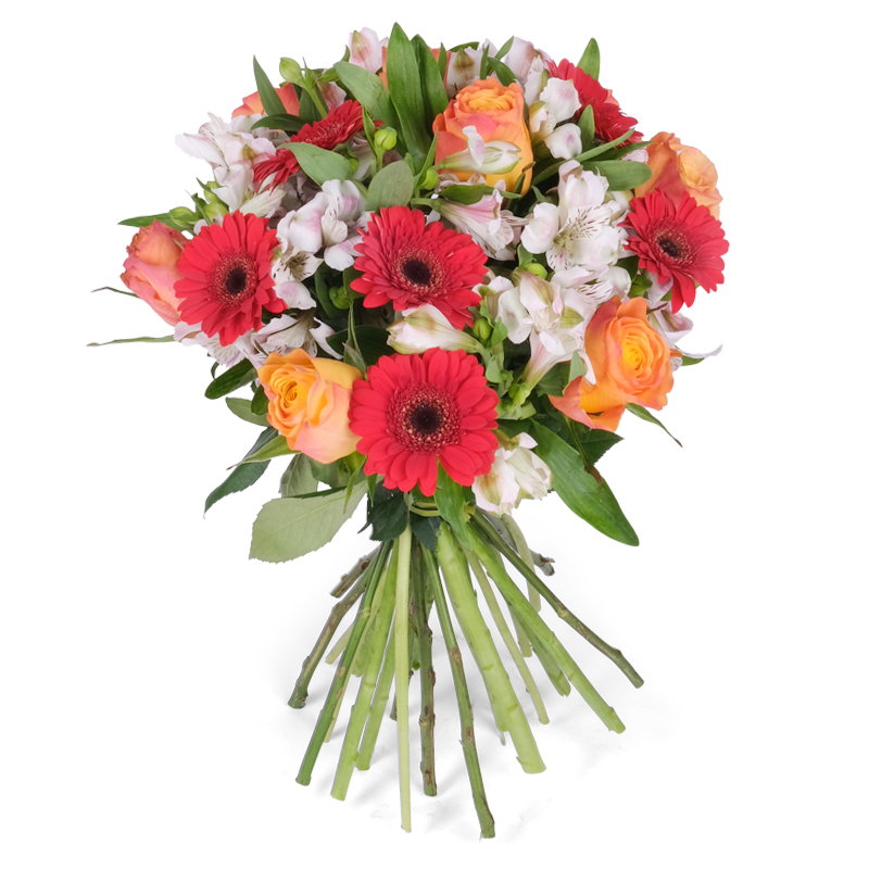Zawsze świeże kwiaty                                      Ten wyjątkowy bukiet łączy energię z elegancją w doskonałych proporcjach, tworząc kompozycję idealną dla współczesnych kobiet łączących wiele ról i cech charakteru. Otoczone liśćmi róże, w towarzystwie gerber i alstromerii, tworzą perfekcyjny prezent, nawet bez okazji!