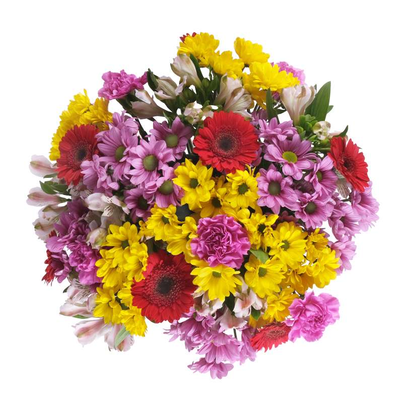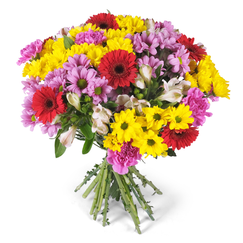 Zawsze świeże kwiaty                                      Różnorodność form i kolorów sprawia, że bukiet jest nie tylko piękny, ale też pełen charakteru. Połączenie santini, gerber, alstromerii oraz goździków to świetna propozycja na prezent zarówno z okazją, jak i bez. Dodaj bilecik!